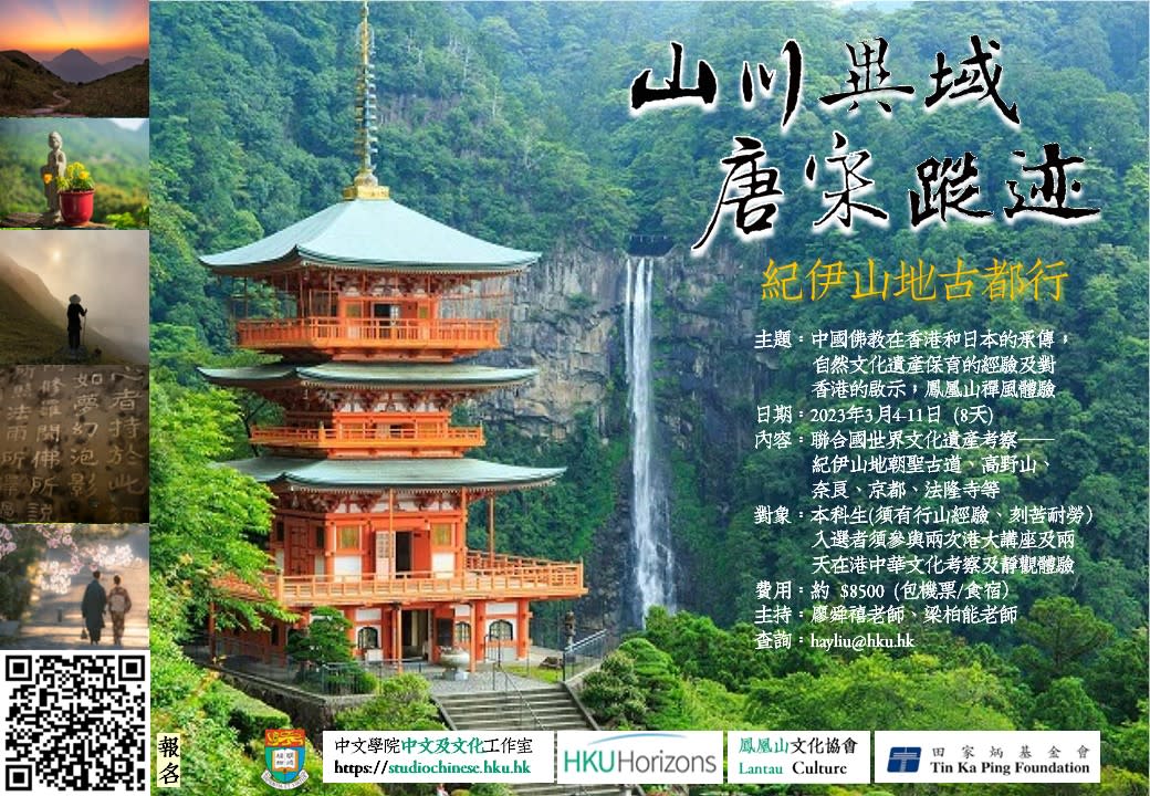 Reading Week考察聯合國世界文化遺產:紀伊山地朝聖古道、高野山、奈良、京都、法隆寺等。尋漢傳佛教在香港和日本的承傳;東瀛自然文化遺產保育的經驗及對香港的啟示;香港鳳凰山禪風體驗;中國佛教藝術賞析。入選者須參與兩次港大講座及兩天在港中華文化考察及靜觀體驗。日期:2023年3月4-11日 (8天)費用:約 $8,500 (包機票/食宿)對象:本科生(需有行山經驗)主持:廖舜禧老師、梁柏能老師 報名:掃描海報二維碼或點擊 https://form.jotform.com/223208568096462